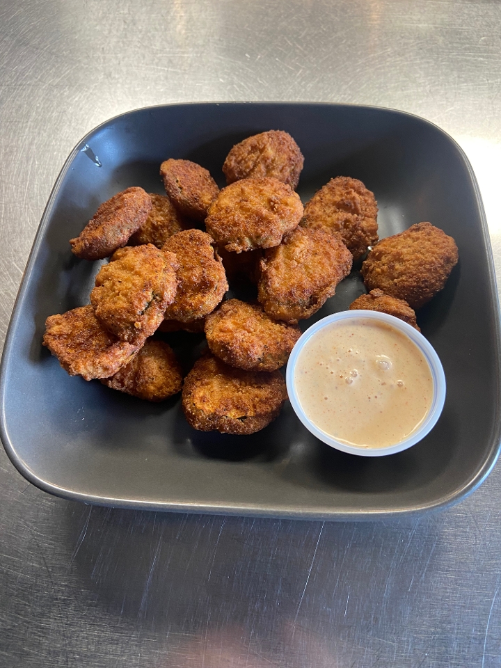 Dill pickle slices battered and fried. Not too spicy but a little kick. Served with our house BBQ ranch