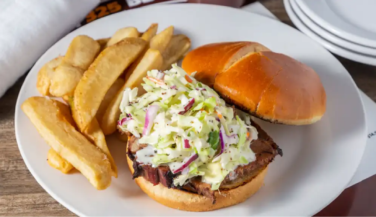 Tender brisket topped with our F325 coleslaw on a brioche bun. Served with your choice of side