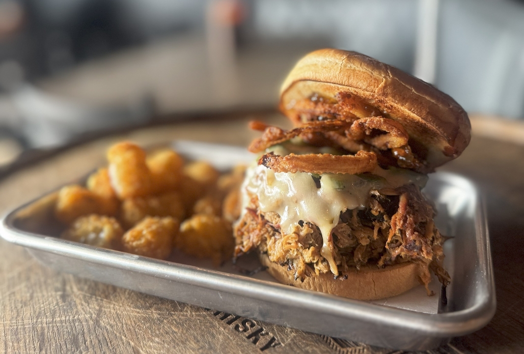 Tots loaded topped with shredded cheese, bacon, sour cream, green onion, and your choice of Pulled Pork, Brisket, or Burnt Ends Brisket $2 Burnt Ends $4